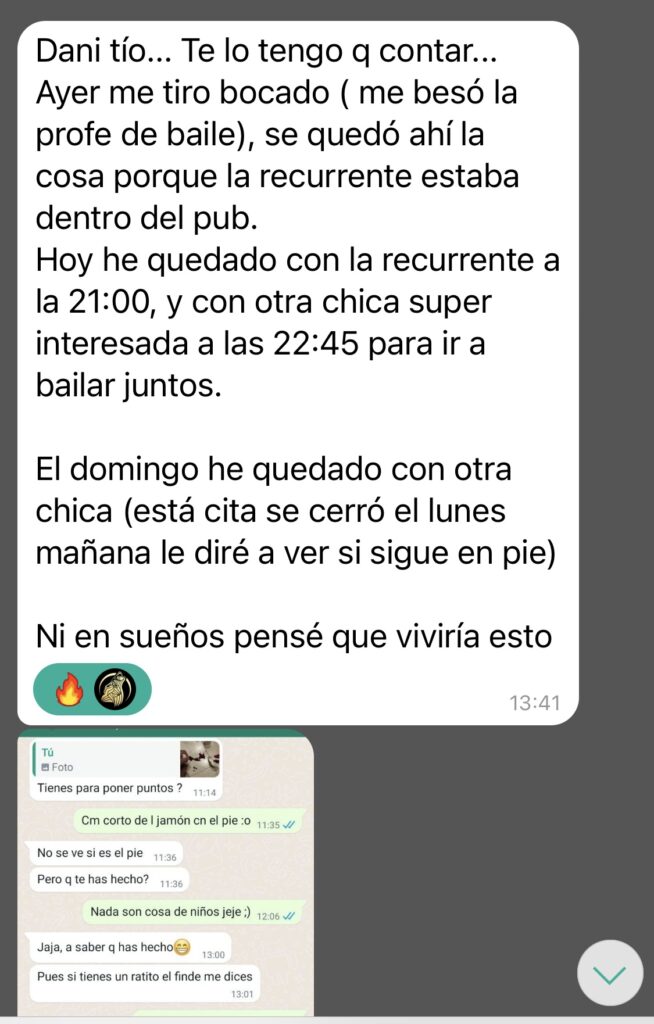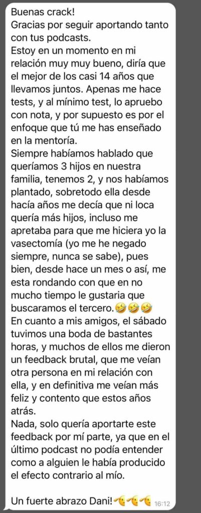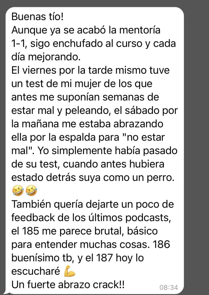 Es el segundo alumno con el que he grabado dos podcasts (aún por publicar). Cuando terminamos la mentoría me dijo que le había cambiado la vida con las mujeres.