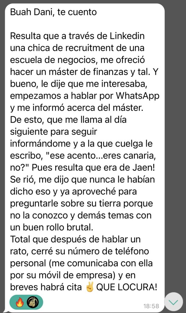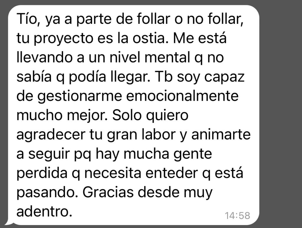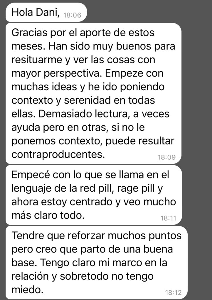 Posiblemente uno de los alumnos más agradecidos que he tenido porque entró con la autoestima muy baja y la mentoría le supuso un cambio de mentalidad enorme y un trampolín con las mujeres.